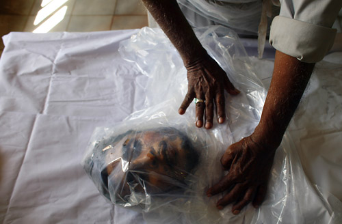 wrapped in plastic after being washed at the Edhi Morgue where many bodies