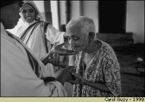 Strong arms help an elderly resident of Mother Teresa's home for the destitute and dying.
