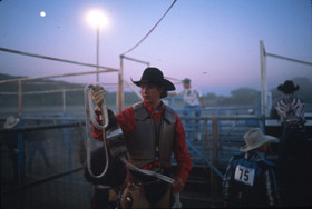 Bullrider Sam Walker checks his gear before mounting up in his next ride. Rodeos compete with Friday night football games for extracurricular activities in the Hill Country. |