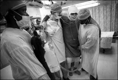 Bond. Burn tech Libby Davis holds Alvaro's oxygen tank. |